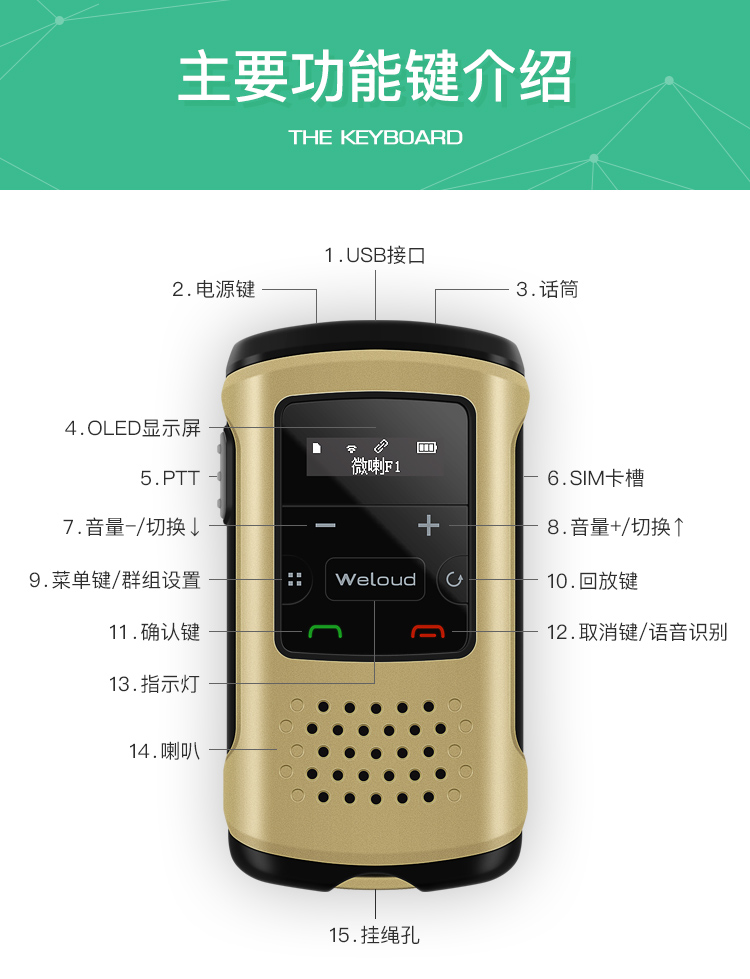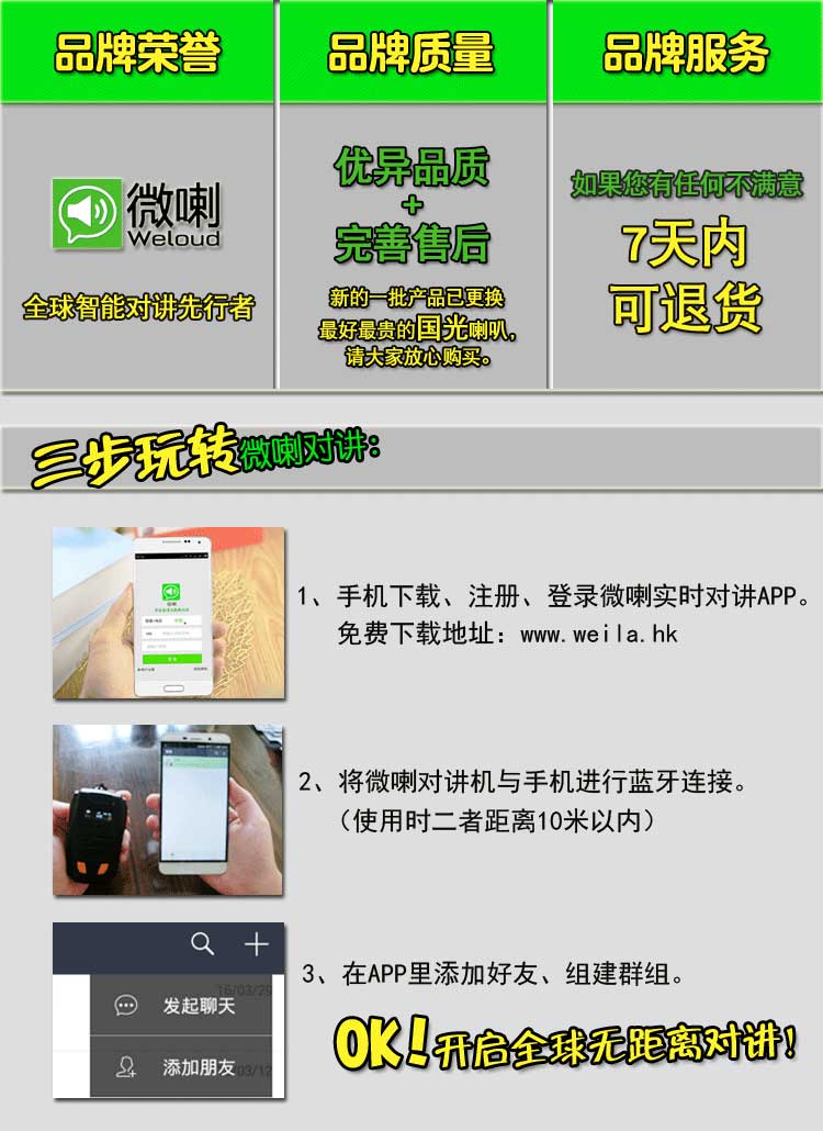 微喇是深圳市沃特实业有限公司自主研发、设计、生产的国内第一款智能蓝牙对讲终端,产品结合客户智能机APP端应用,形成一套无距离限制对讲系统,此系统拥有单对单对讲、多人对讲、自由组群、集群调度、团队沟通、GPS定位等功能,产品非常适合替代传统的模拟对讲机和手机对讲机,具有无距离限制、无服务费、不用调频、不用插卡、通话保存和回放、安全保密、精准定位等优点,广泛适用于企业集团管理、自驾游、 旅游管理、出租车、物流车队、户外活动、小团队沟通、政企客户等。
